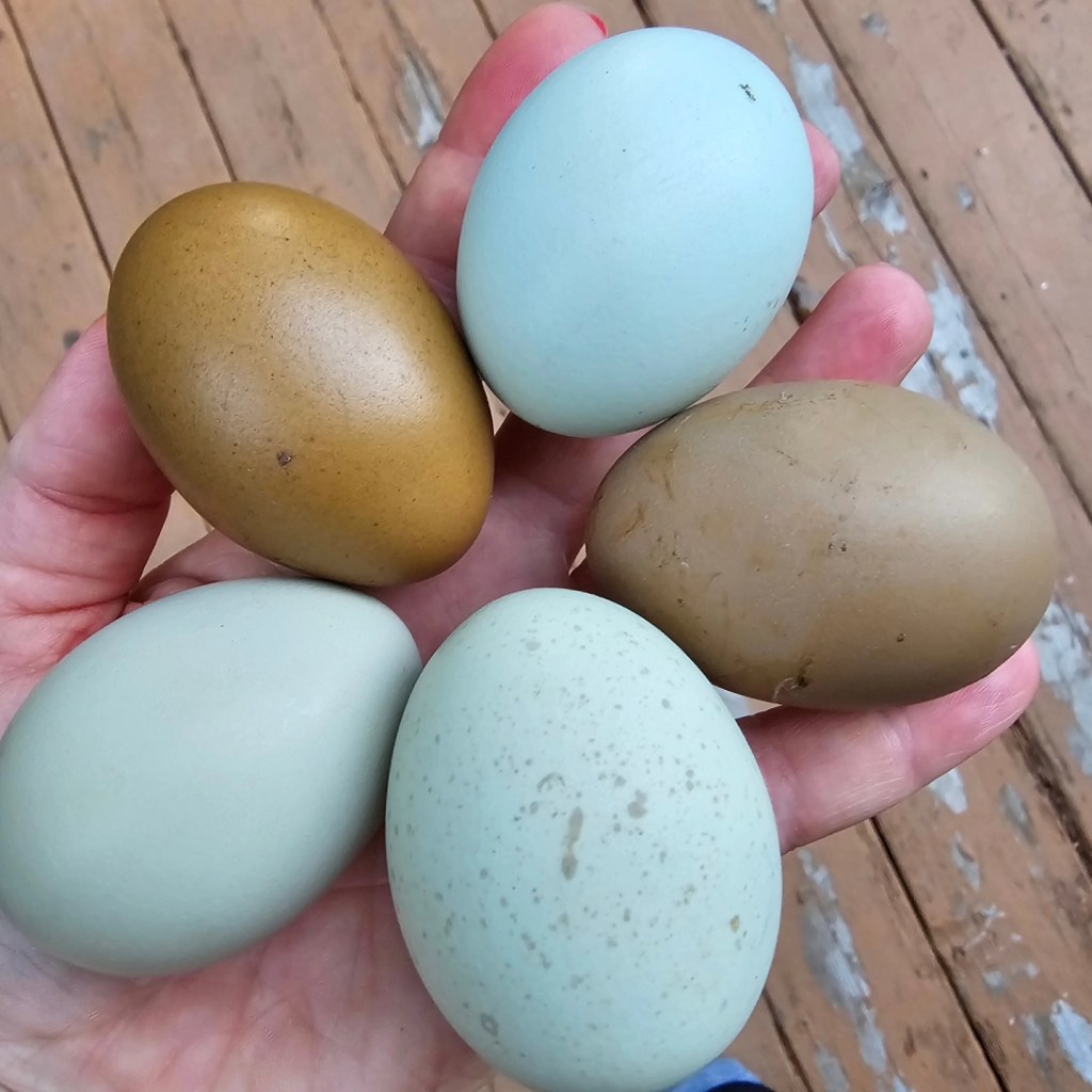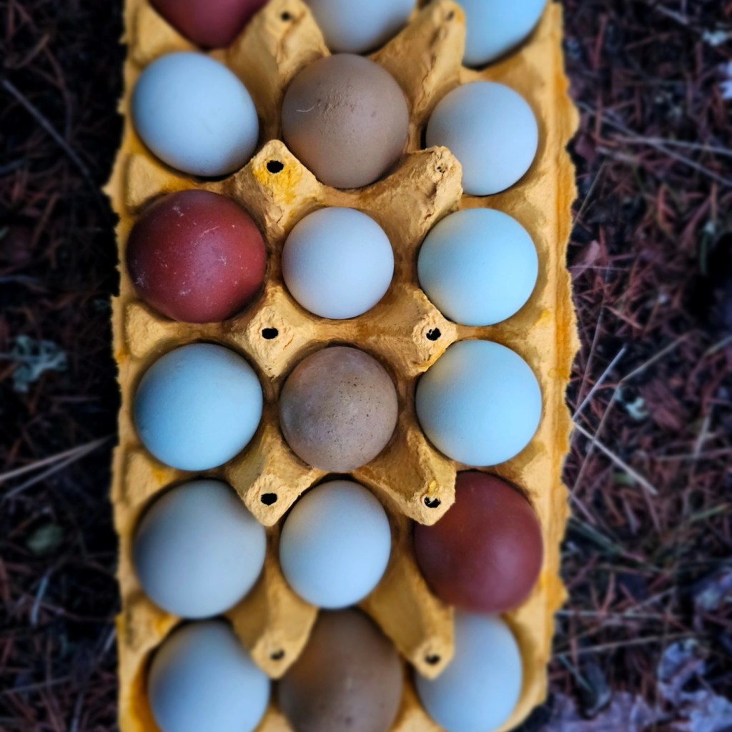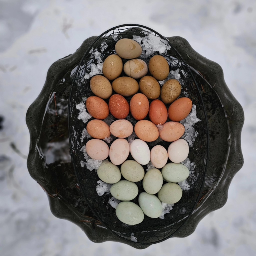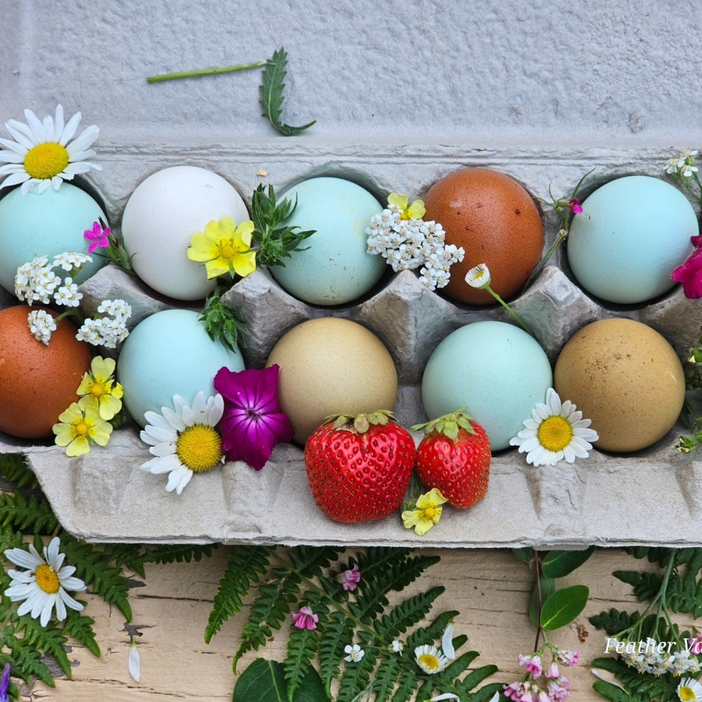 Inspired by the beautiful nature surrounding us our eggs reflect the diverse and abundant colors of the mountains, forest and lakes nearby. These treasures we hold near and dear. Ermine, Chocolate/Mauve, Frizzle, and Naked Neck Genetics go into the Unique Look of Feather Valley Farm Colored Eggers. I wanted a fun pen. And this is it! What’s more fun than the daily rainbow treasure hunt? Maybe the fact that these colored eggers aren’t your typical boring looking flock members. They are bred to be cheeky, frizzled, naked neck, calico, ermine, chocolate, mauve and more! I will always focus on hatching the most unique and beautiful birds and eggs!